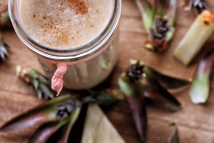 - Euren Kombucha-Cocktail in zwei Gläser füllen und mit einem Stück Ananas und einem Blatt vom Strunk verzieren, den Zimt auf dem Getränk verteilen und sofort genießen.