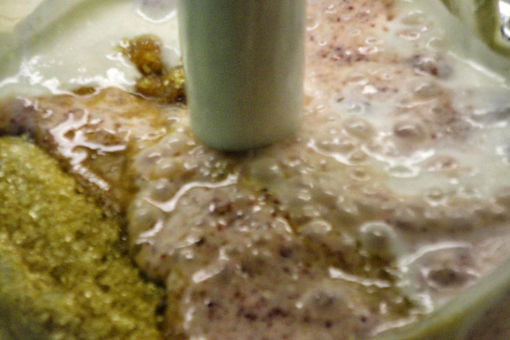 2. Die Beeren, Euren Bio-Milchkefir und den Zucker mit Hilfe eines Stabmixers pürieren.