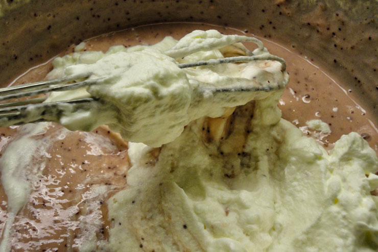 7. Dann die steifgeschlagene Sahne aus dem Kühlschrank vorsichtig unter die Beeren-Kefir-Mischung heben.