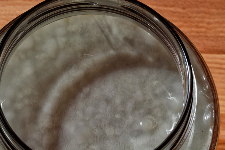 wieder neu angesetzt mit dem Ergebnis, dass sich oben eine weiße Schicht gebildet hat, die mir nach Schimmelbefall ausschaut,