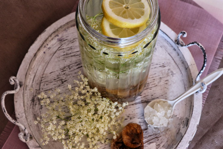Add the elderflowers or elderflowers tea and let it ferment 1-3 days as you like