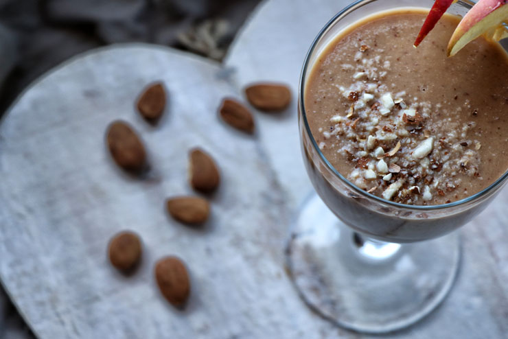 - Euren Drink auf 2 passende Gläser verteilen und mit den Apfelstücken und Mandeln toppen.