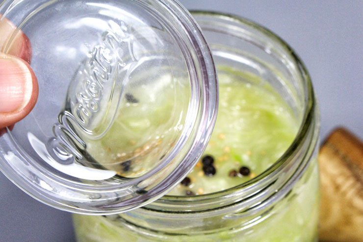Jetzt das Glas schön sauber machen, abtrocknen und den Gärverschluss mit Hilfe des Schraubverschlusses am Glas fixieren. Dieses Glas lagerst Du nun für 1 Woche bei Zimmertemperatur. Anschließend für mindestens 2 – 4 Wochen im kühlen Keller, Vorratsraum oder gar Kühlschrank fermentieren lassen. Die Fermentation bei niedrigerer Temperatur soll verhindern, dass das Sauerkraut zu sauer wird. Nachdem das selbstgemachte Sauerkraut insgesamt 3 Wochen fermentieren durfte, kannst Du schon einmal probieren, ob der Geschmack gut ist. Wer sich so lange gedulden kann, sollte das Sauerkraut insgesamt 8 Wochen gären lassen. Dann ist es aus unserer Sicht perfekt. Wenn es schmeckt ist der Fermentationsprozess abgeschlossen und Du kannst das leckere Kraut genießen. Wenn es noch nicht so mundet, Deckel wieder drauf und weiter fermentieren lassen. Einmal angebrochen ist Dein selbst hergestelltes Sauerkraut kühl gelagert über mehrere Monate haltbar. TIP: Generell ergibt es beim Fermentieren, egal ob Kefir, Kombucha, Sauerteig, Miso oder eben Sauerkraut Sinn, dass Gärgefäß zu beschriften. Einfach auf Glas das aktuelle Datum und den entsprechenden Inhalt vermerken. Insbesondere wenn man mit der Fermentation beginnt und noch testen muss, ist dies sehr hilfreich.
