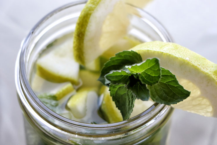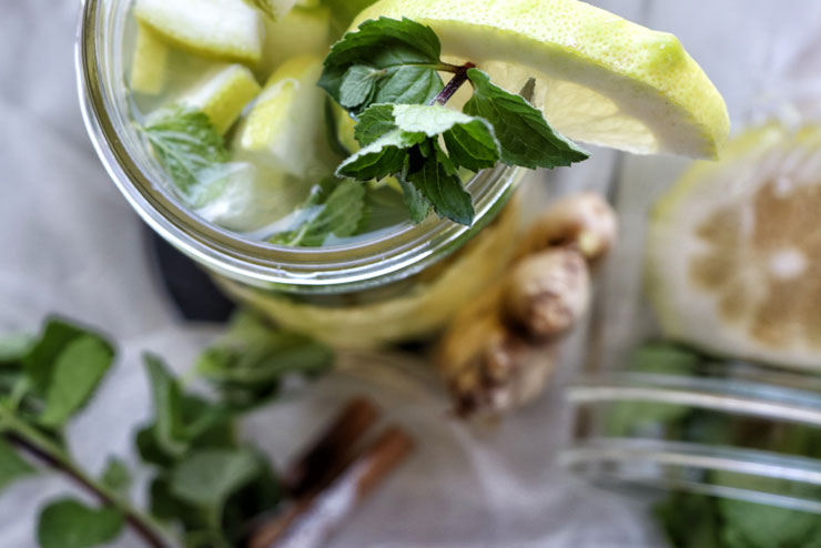 - Nun die restlichen Zutaten (Kombucha, Honig und Zitronenstücke, Minzblätter) in eine große Kanne / Flasche geben und miteinander vermischen.