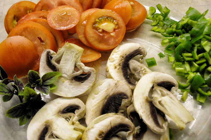 Die frischen Zutaten für den Belag waschen und in kleine Stücke/Würfel schneiden.