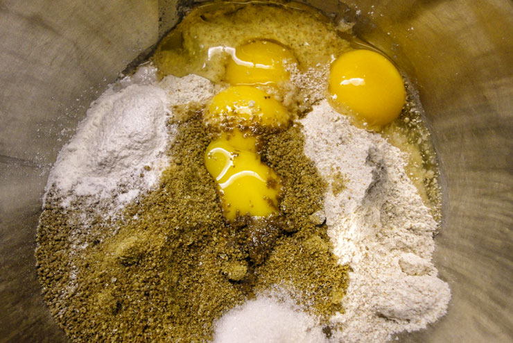 - Die Zutaten Eigelb, Kokosblütenzucker, Vollkornmehl, Backpulver, Vanillezucker und Butter in eine Rührschüssel geben und mit Knethaken zu einem Teig verarbeiten.