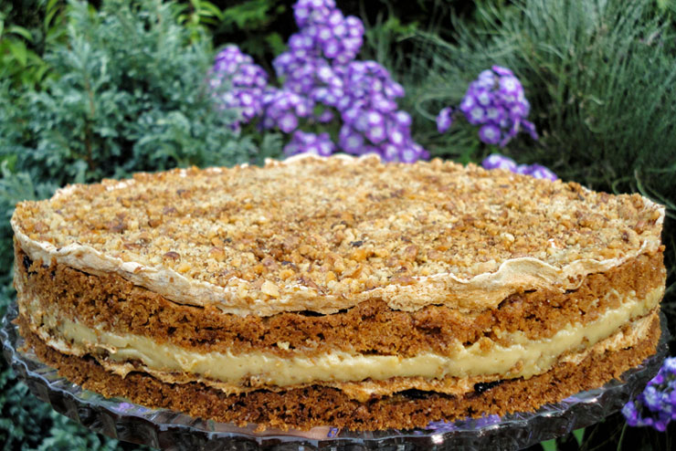 - Den ersten Boden auf eine Tortenplatte geben und die Puddingcreme darauf verteilen.